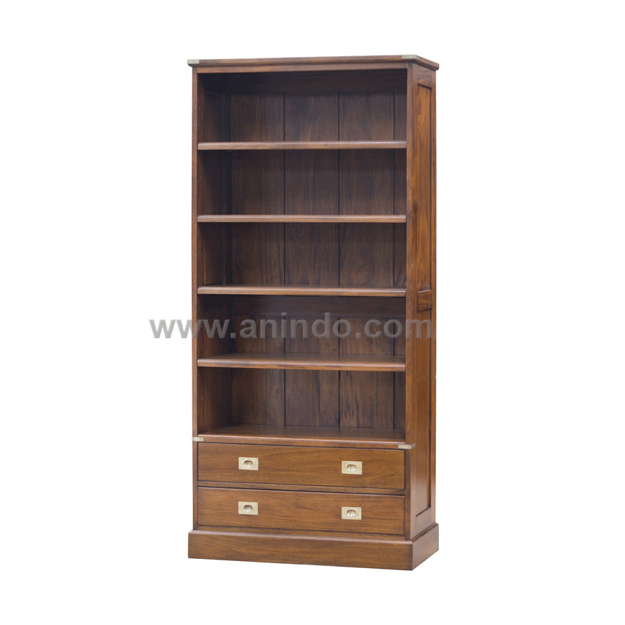 Open bookcase 2 drawers with 4 shelves is made of solid mahogany wood in pecan finish.