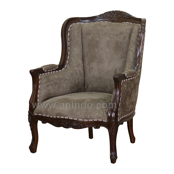 Wings carved chair is made of solid mahogany wood in walnut finish. Upholstered in brown suede fabric.