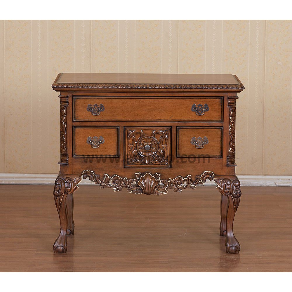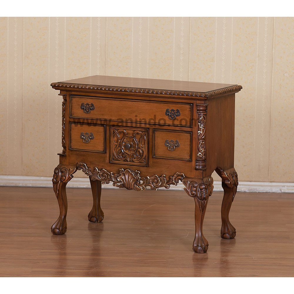 Chippendale lowboy 4 drawers is made of solid mahogany wood in pecan finish. Antique solid brass handles.