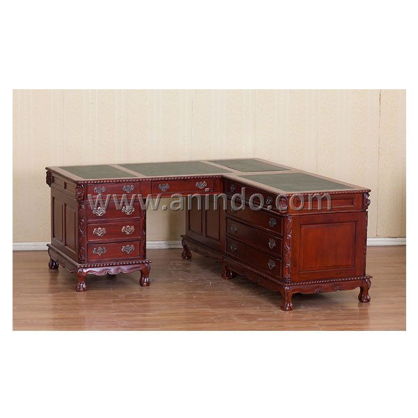 Partner desk L carving is made of solid mahogany wood in walnut finish. With green faux leather top. Antique solid brass handles.