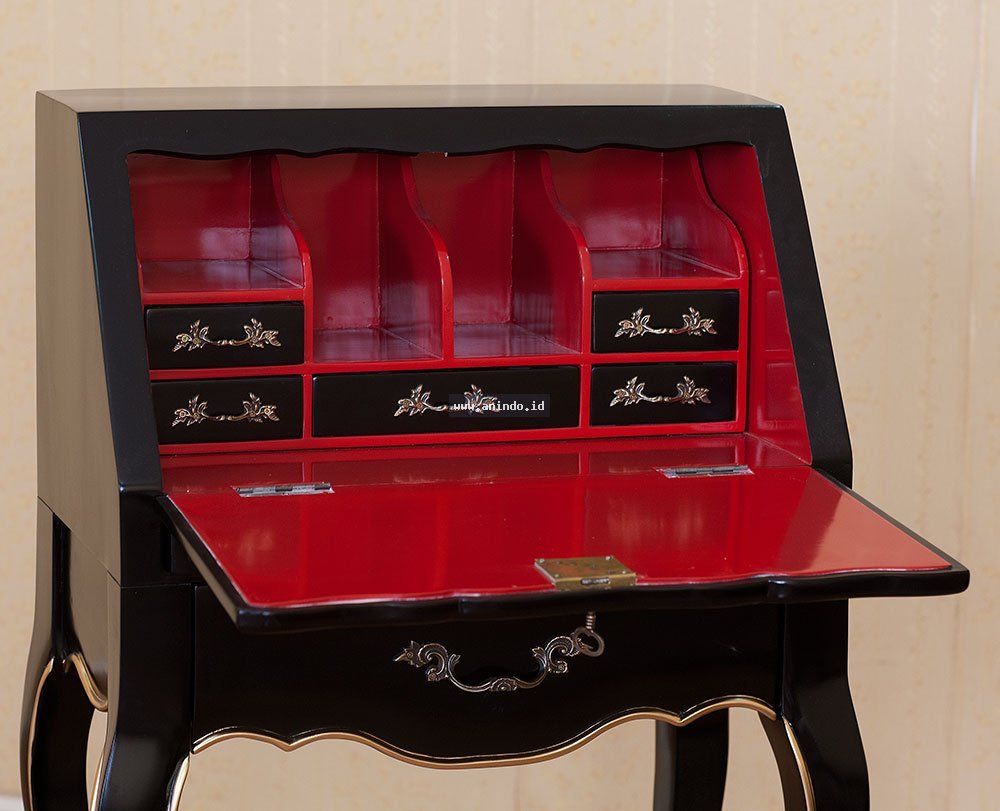 Diana writing desk is made of mahogany wood in glossy black painted combined with Chinese red painted finish. Antique solid brass handles.