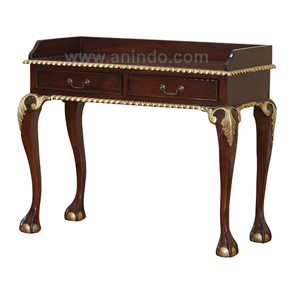 writing table 2 drawers is made of solid hard wood in medium mahogany with gold painted finish.