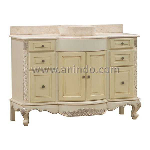 Luis bathroom vanity is made of solid mahogany wood in cream painted finish. Without marble top. Antique solid brass handles.