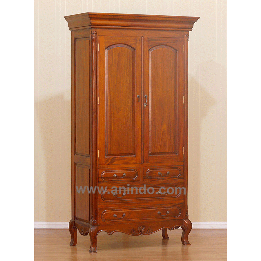 2 doors wardrobe with 4 drawers is made of solid mahogany wood in pecan finish. Antique solid brass hardwares.