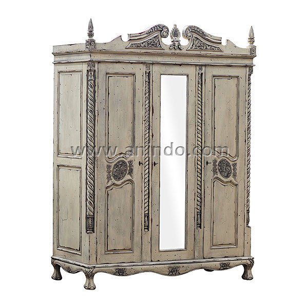 3 doors mirrored armoire is made of solid mahogany wood in antique distressed cream painted finish. Antique solid brass hardwares.