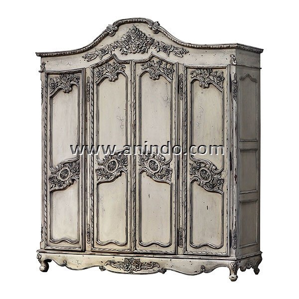 Heavy carving 4 doors armoire is made of mahogany wood in antique distressed white painted finish. Antique solid brass hardwares.