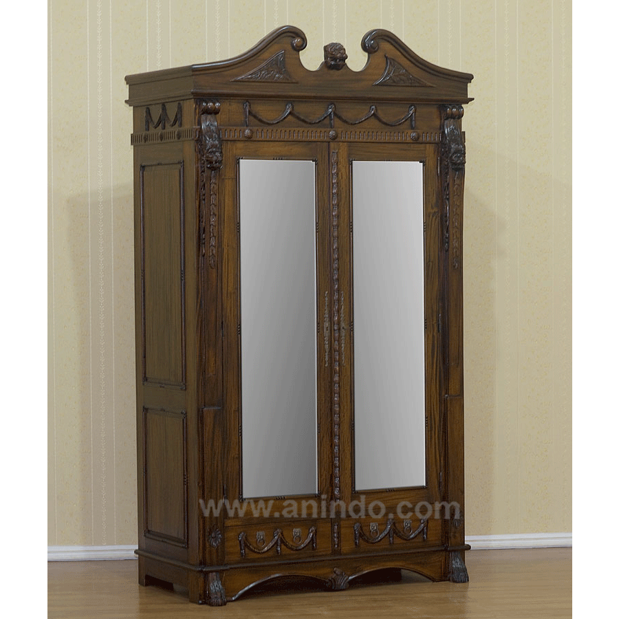 Lion 2 doors & 2 drawers armoire with mirror is made of solid mahogany wood in pecan finish. Antique solid brass hardwares.