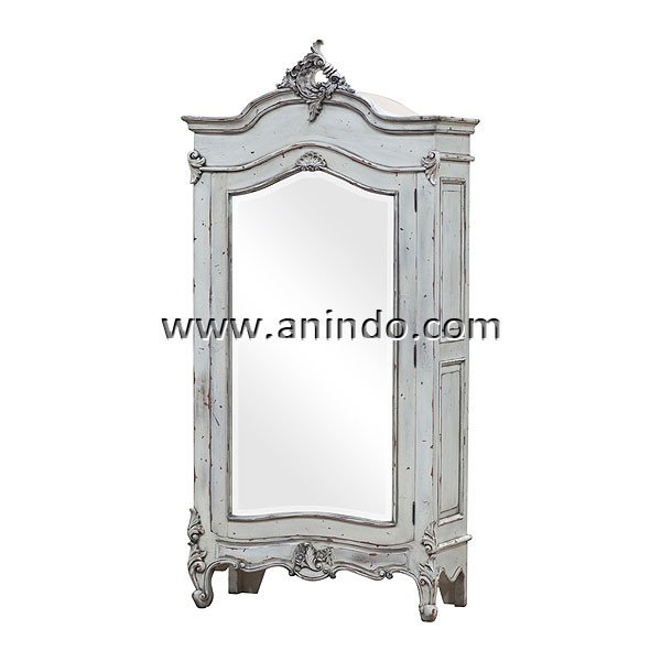 Richard 1 door mirrored wardrobe is made of solid mahogany wood in distressed white painted finish. Antique solid brass handle.