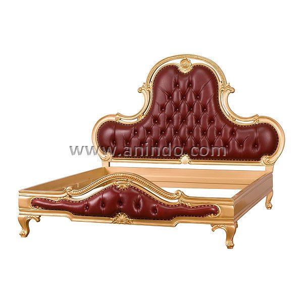 Bunga bed is made of mahogany wood in gold leaf finish. Upholstered in maroon genuine cow leather. It's king size bed. Available for all mattress size.