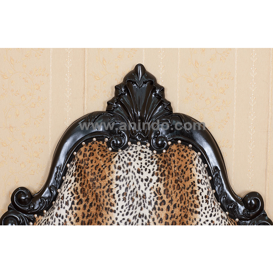 Candle carved headboard is made of mahogany wood in black painted finish. Upholstered in tiger motiff fabric. It's queen size headboard. Available for all mattress size.