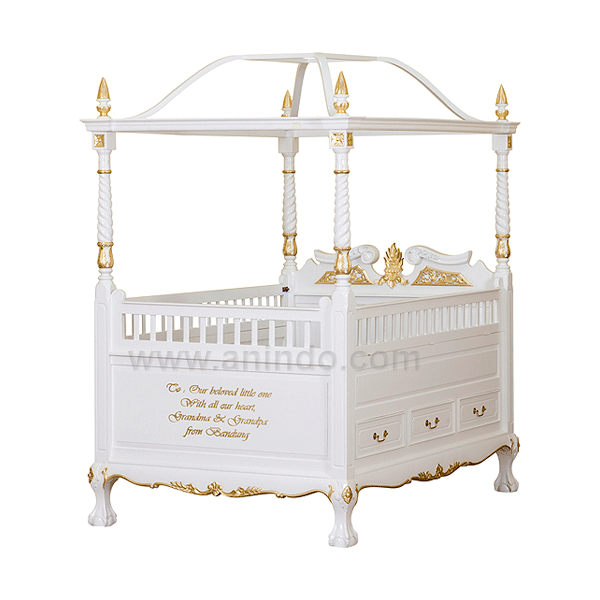 Canopy baby crib is made of mahogany wood in white combined with gold painted ...