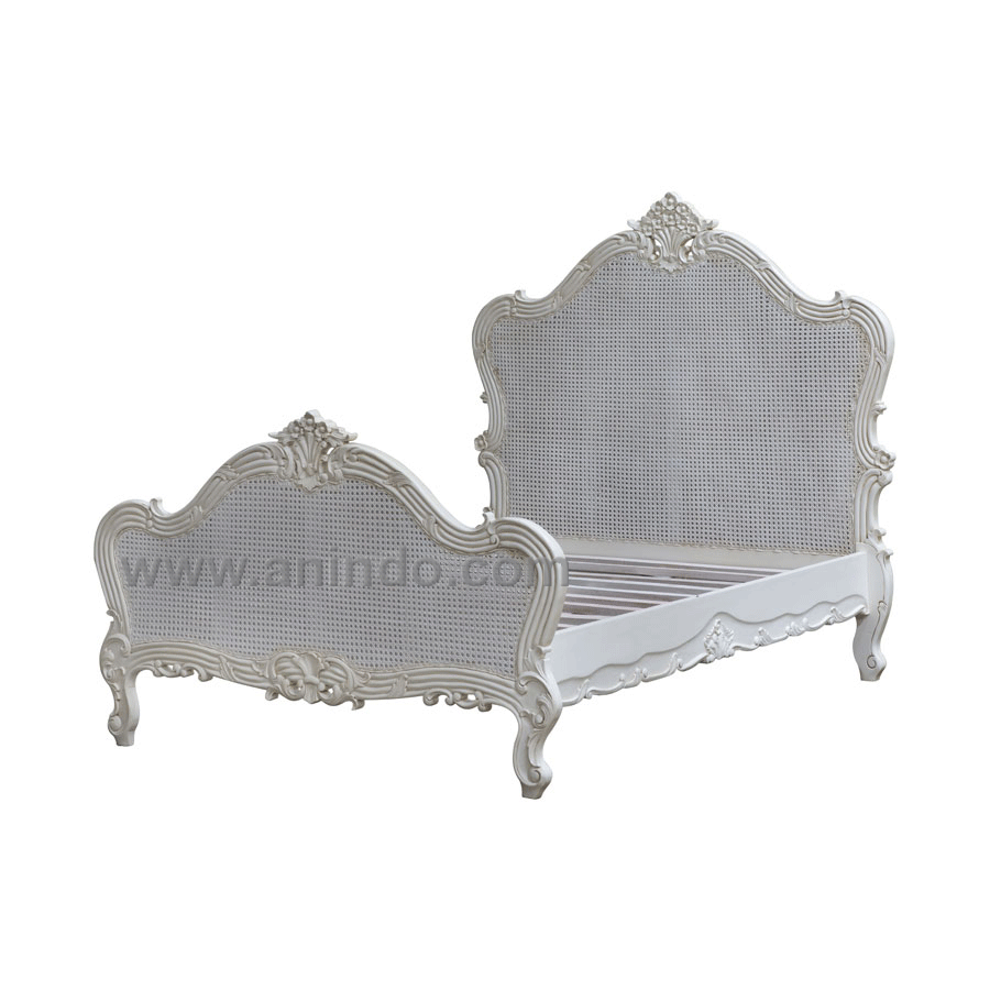 Carved rattan bed is made of solid mahogany wood in white painted finish. It's queen size bed. Available for all mattress size.