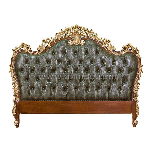 Crocodile headboard is made of mahogany wood in pecan combined with gold painted finish. Upholstered in green fake crocodile leather. It's queen size headboard. Available for all mattress size.