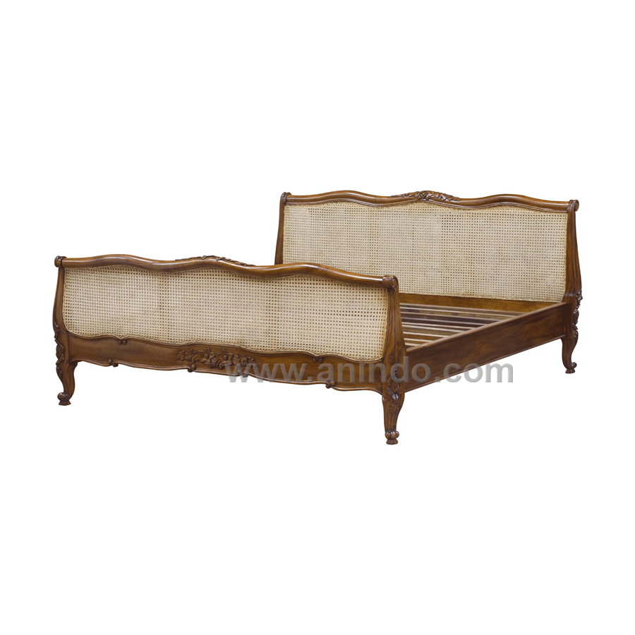 French bed with rattan is made of solid mahogany wood in pecan finish. It's queen size. Available for all mattress size.