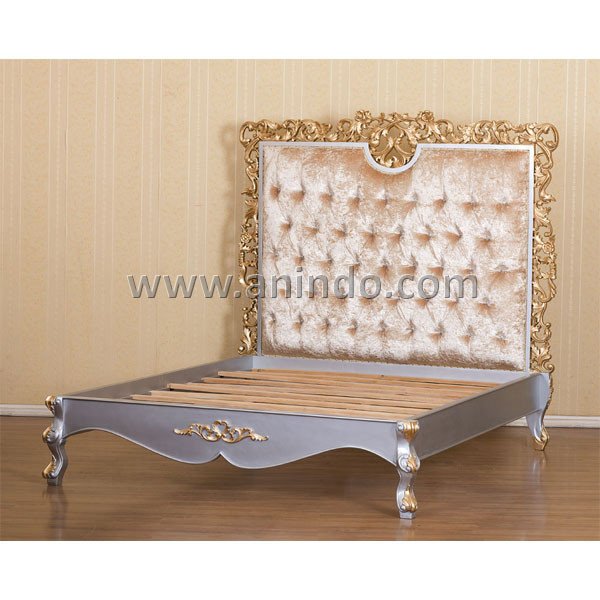 Hola carved bed is made of mahogany wood in silver combined with gold painted finish. Upholstered in gold fabric. It's queen size bed. Available in all mattress size.