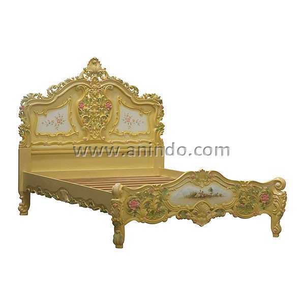 New rococo bed is made of mahogany wood in yellow painted with painting details finish. It's queen size bed. Available for all mattress size.