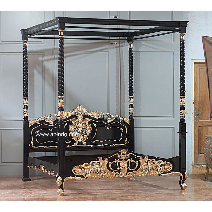 New Rococo 4 Poster Bed made of solid mahogany wood in black combined with gold painted finish. King size bed. Available for all mattress size.