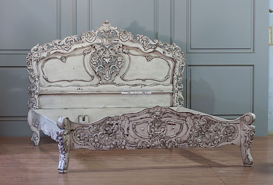 Rococo bed king size is made of mahogany wood in vintage distressed white painted finish. Available in all mattress size.