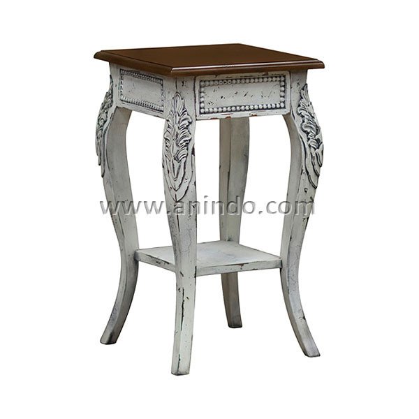 4 legs bedside table is made of mahogany wood in distressed white painted finish with solid wood top.
