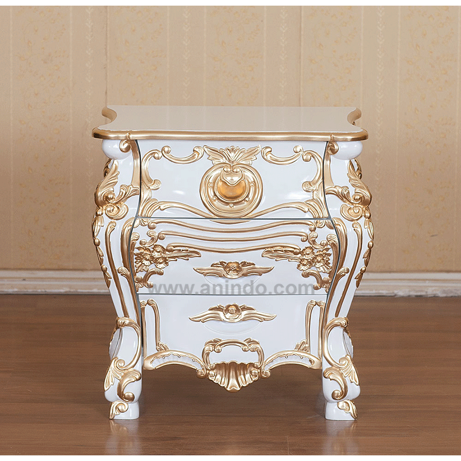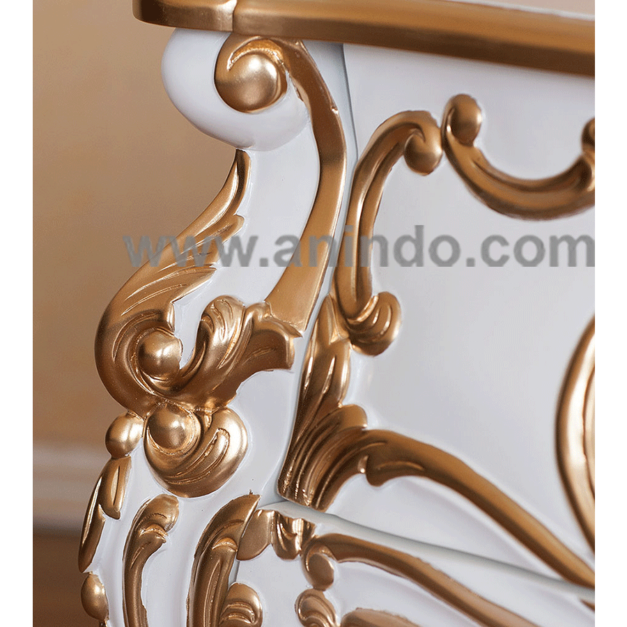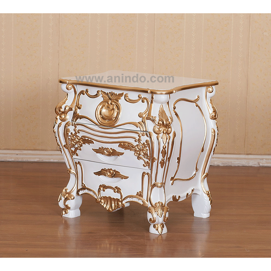Baroque bedside cabinet 3 drawers carving is made of mahogany wood in white combined with gold painted finish.