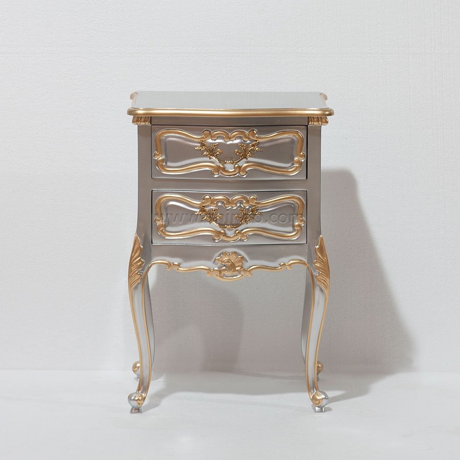 Rococo bedside cabinet 3 drawers is made of mahogany wood in silver painted ...
