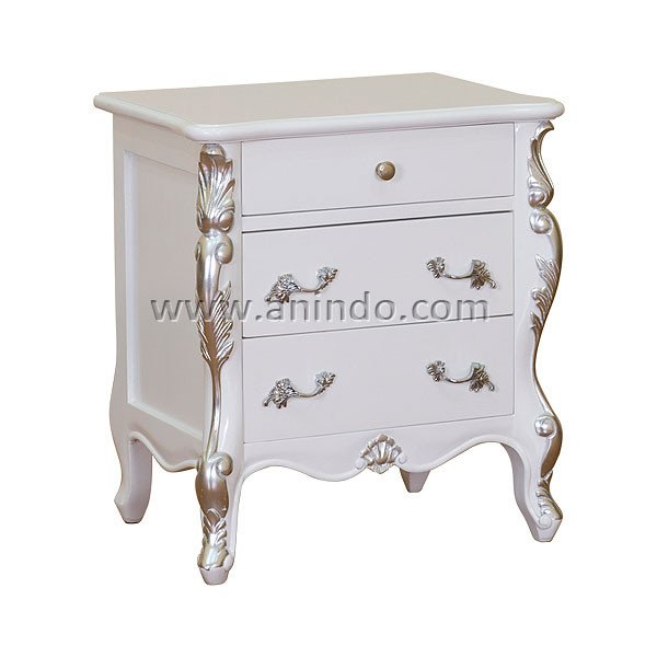 Keira bedside cabinet 3 drawers is made of mahogany wood in white combined with silver painted finish. Silver solid brass handles.