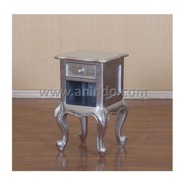 Lyon bedside cabinet 1 drawer is made of mahogany wood in silver leaf finish. Solid mahogany wood handle.