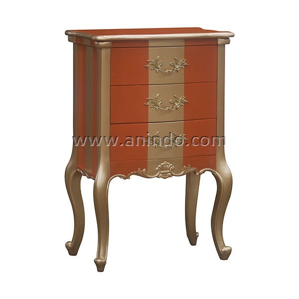 Paula 3 drawers bedside cabinet is made of mahogany wood in orange combined with gold painted finish. Antique solid brass handles.