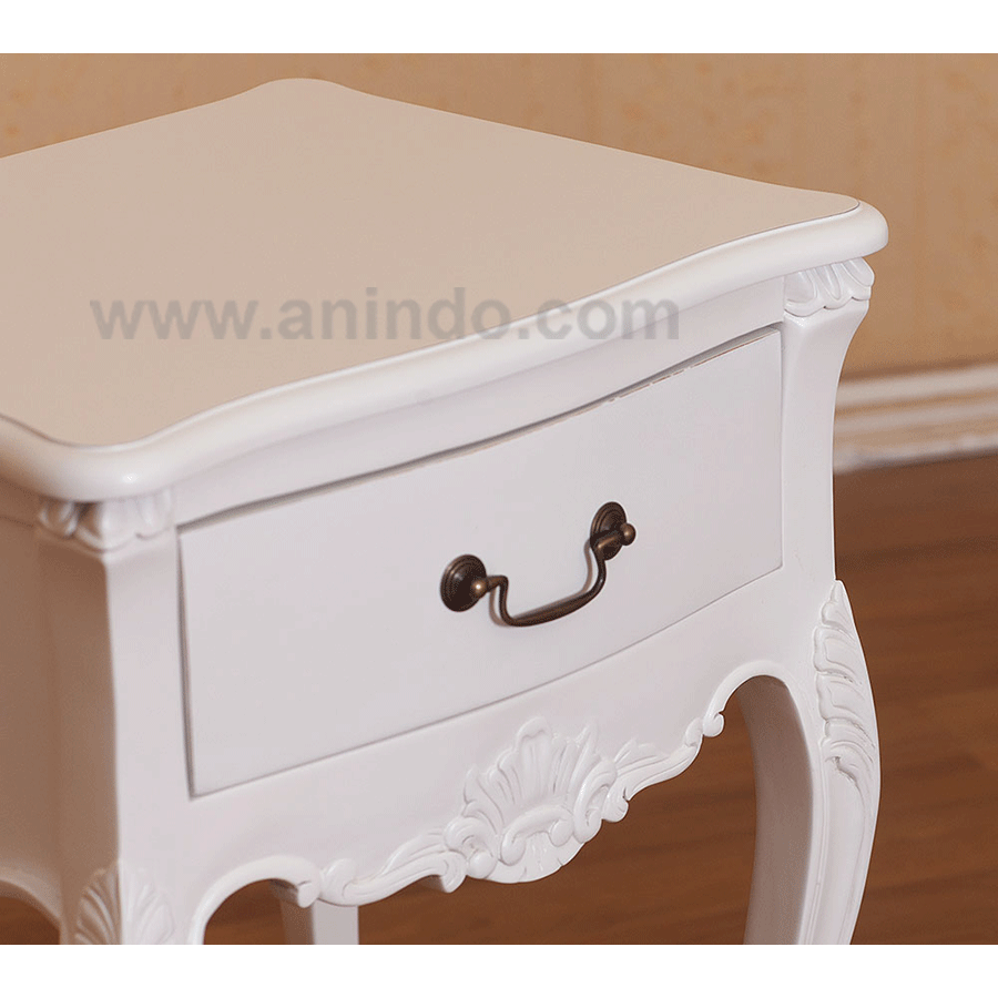 Timo bedside table 1 drawer carving is made of mahogany wood in white painted finish. Antique solid brass handle.