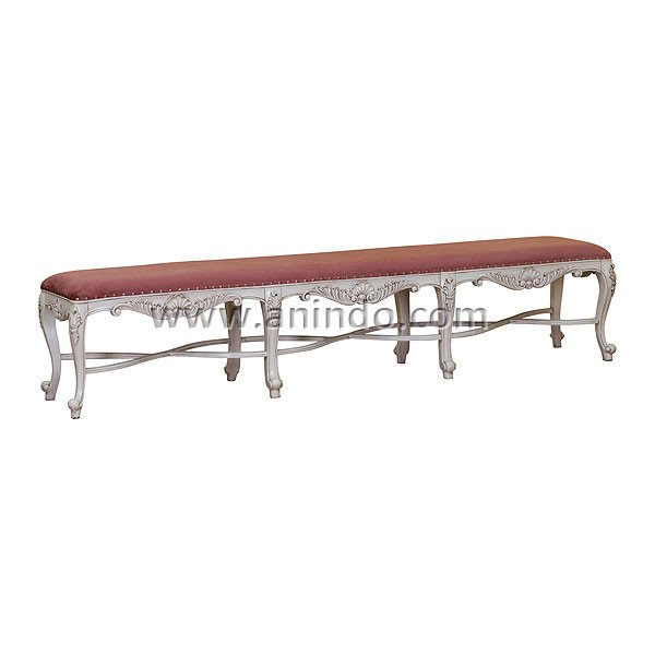 Carved bench long is made of mahogany wood in antique white painted finish. Upholstered in champagne velvet fabric.