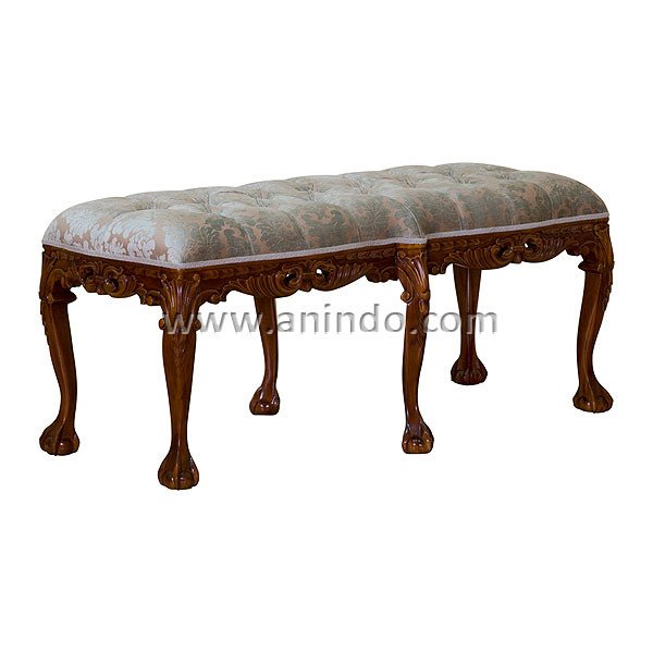 Claws bench is made of mahogany wood in walnut finish. Upholstered in green floral fabric.
