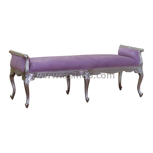 French carved bench is made of mahogany wood in silver leaf finish. Upholstered in purple velvet fabric.