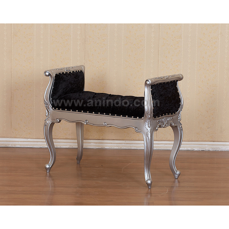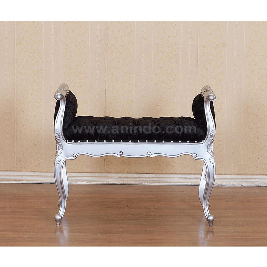French small bench is made of mahogany wood in silver leaf finish. Upholstered in black silk fabric.