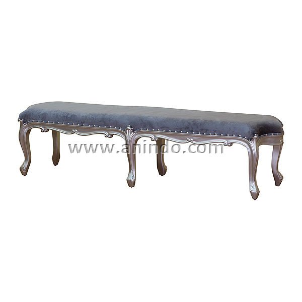 Miami bench is made of mahogany wood in silver painted finish. Upholstered in grey velvet fabric.