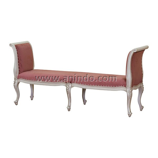 Tall arm bench is made of mahogany wood in antique white painted finish. Upholstered in champagne fabric.