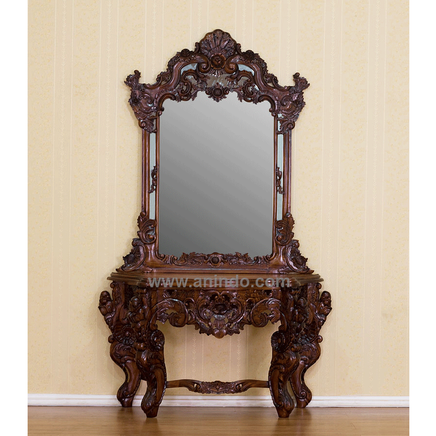 Baroque dressing table with mirror carving is made of solid mahogany wood in walnut finish.