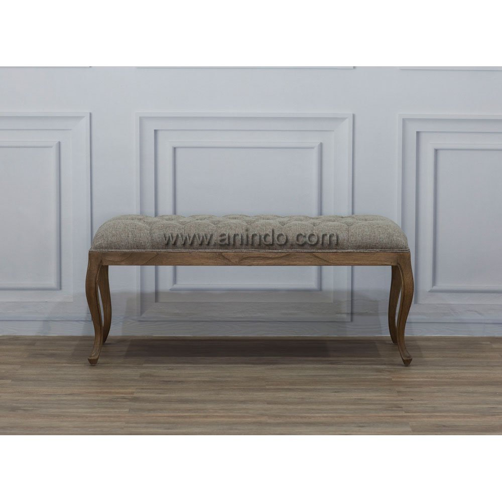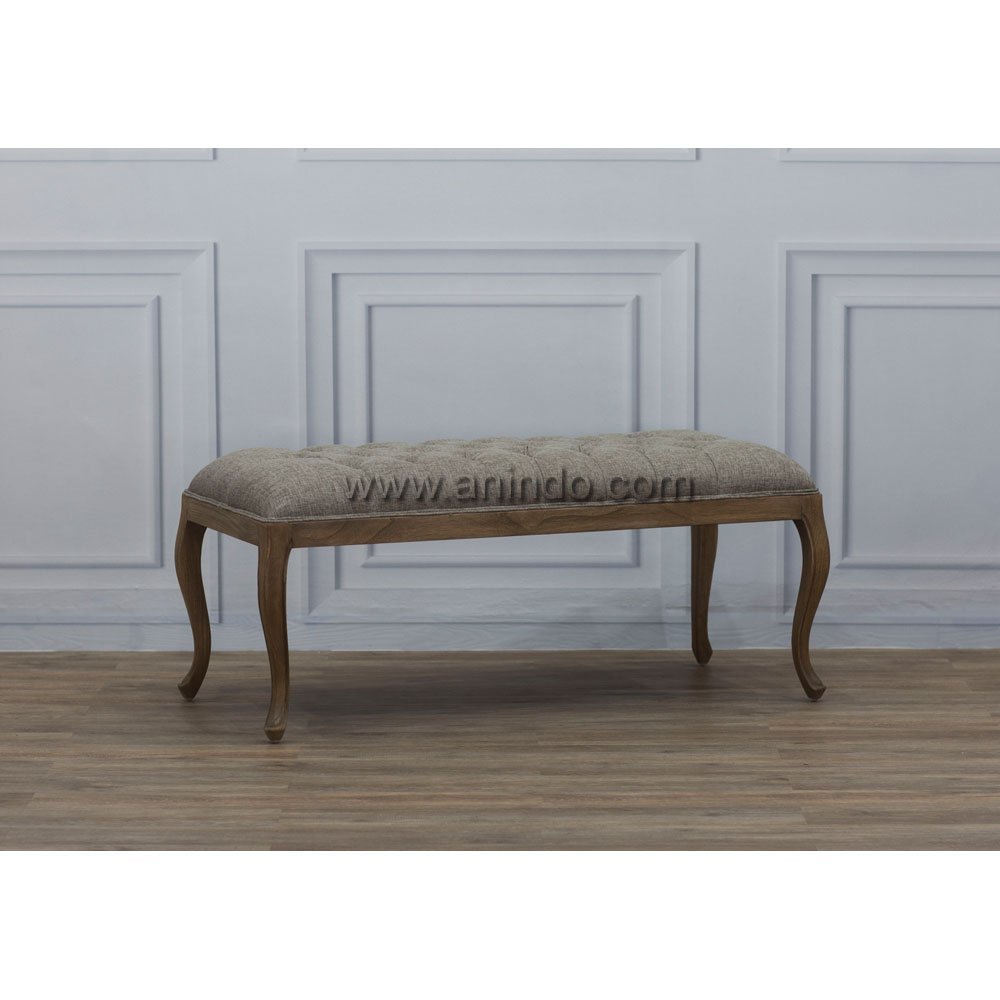 Charlotte stool is made of solid mindi wood. Antique finish. Upholstered in brown fabric.