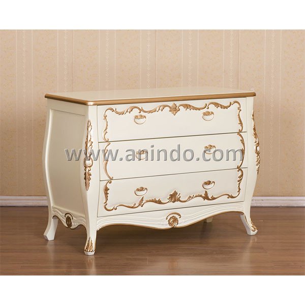 Lampitan chest of 3 drawers is made of mahogany wood in ivory combined with gold painted finish.