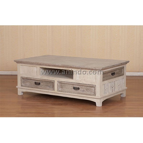 Pendo coffee table 6 drawers is made of sustainable mango wood in white washed finish. Antique solid brass handles.