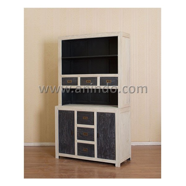 Pendo kitchen cabinet 2 doors with 6 drawers is made of sustainable mango wood in white washed finish. Antique solid brass handles.