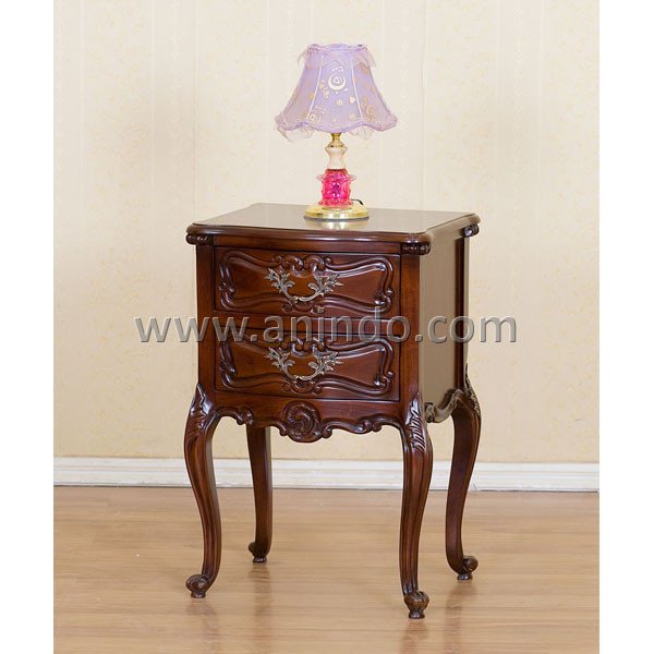 Sendang bedside table 2 drawers is made of mahogany wood in walnut finish. Antique solid brass handles.