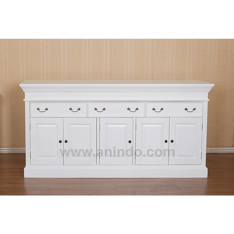 5 doors 3 drawers buffet is made of mahogany wood in white painted finish. Antique solid brass handles.