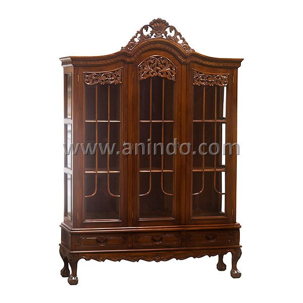 Triple doors showcase is made of mahogany wood in walnut finish.