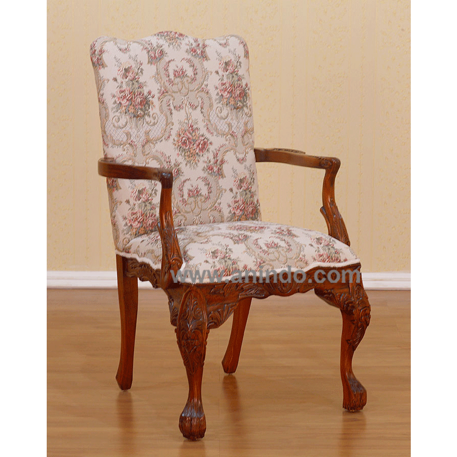 Our arm?chair carved is made of mahogany wood in pecan finish. Upholstered in?gold floral fabric.