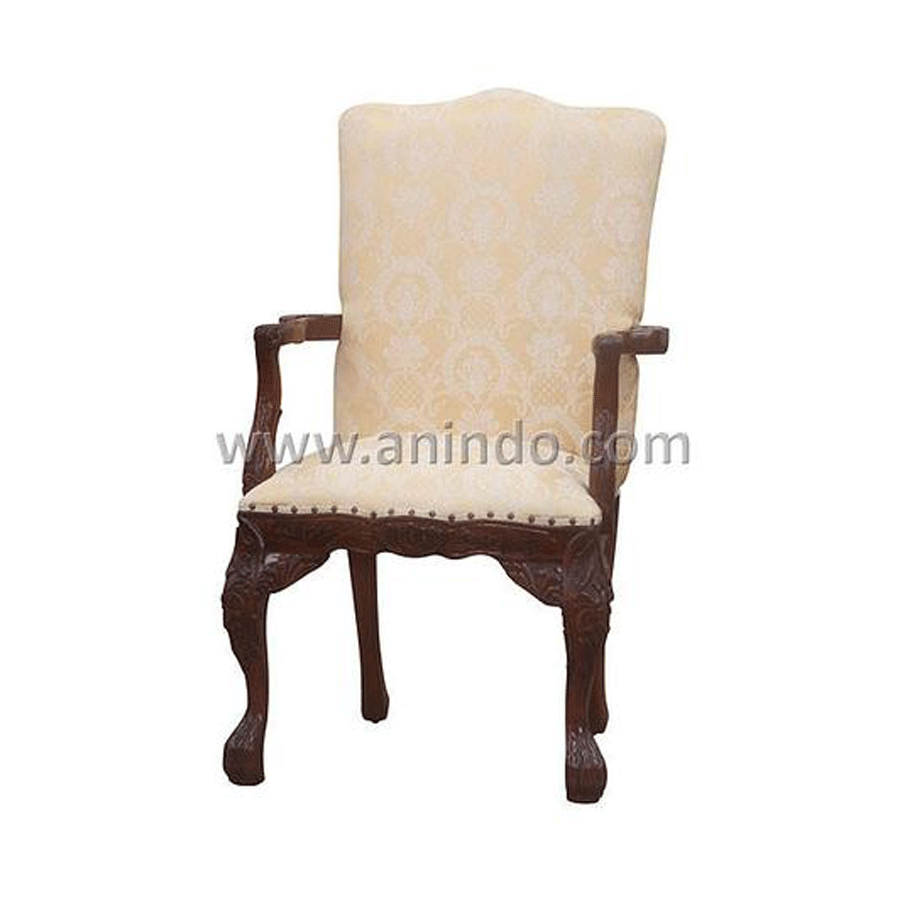 Carved chair arm is made of mahogany wood in pecan finish. Upholstered in cream fabric.