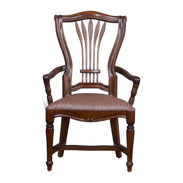 Our simpson arm chair is made of mahogany wood in pecan finish. Upholstered in brown leather.