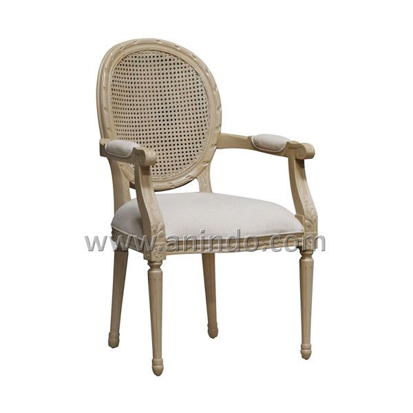 Our french oval chair c arm is made of mahogany wood in cream painted finish. Natural rattan back. Upholstered in cream fabric.