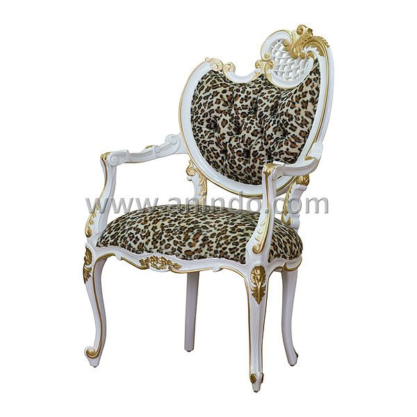 Our gull dining chair carver is made of?mahogany wood in white combined with gold painted finish. Upholstered in leopard motif fabric.