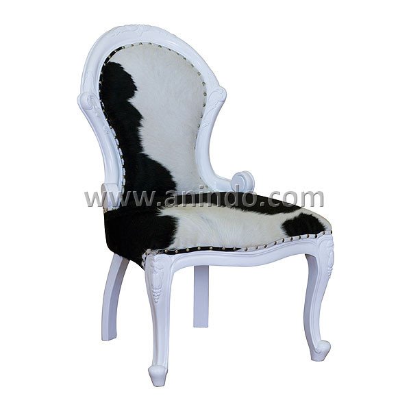 Orlando white chair is made of solid mahogany wood in antique white painted finish. Upholstered in fake goat skin fabric.