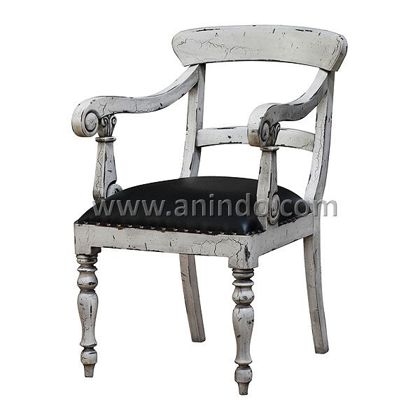 Our rail back arm chair antique is made of?mahogany wood in antique distressed white painted finish. Upholstered in black faux leather.